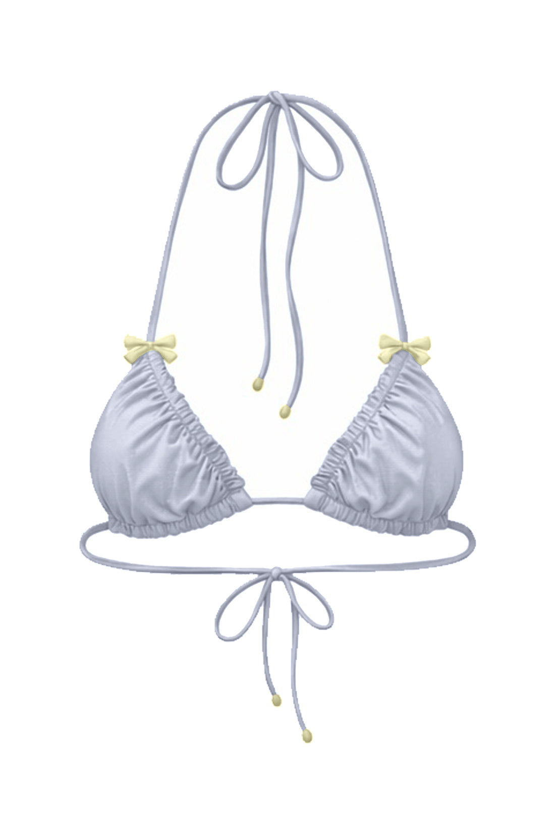 Sculpting minimal ruched triangle top with adjustable straps at the shoulder and ties in the back. Lightweight with...