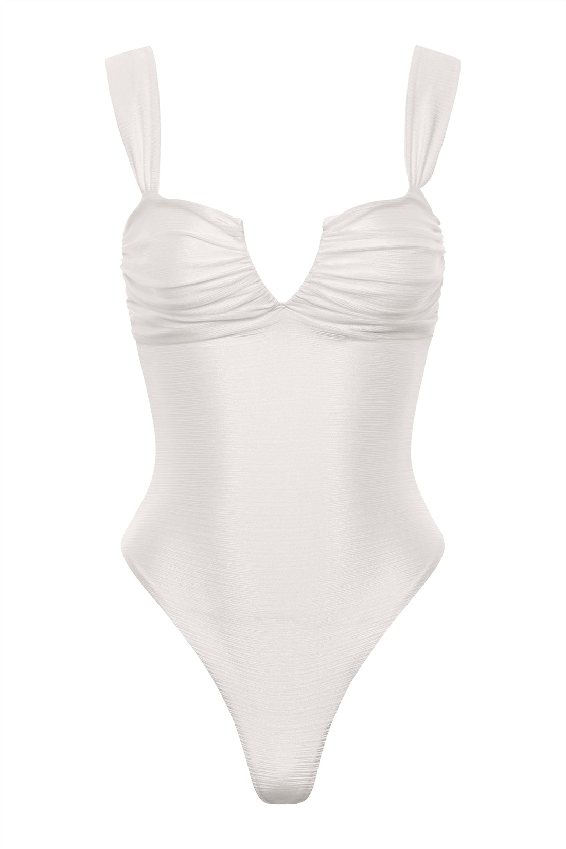 The Natala one piece in pearly white redefines classic swimwear with its sculptural silhouette. a...