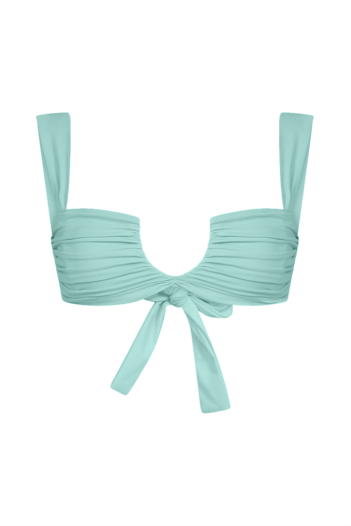 Meet effortless elegance with this sophisticated but poetic bikini top featuring signature wide shoulder straps and luxurious ruching detail at the bust. The structured design offers excellent support while maintaining a super flattering silhouette. Crafted from a premium blend of 82% Nylon and 18% Elastane in our signature matte finish, this piece delivers comfort and durability. Available in Sky Blue, Ivory Aruba Blue, Aruba Blue Ivory, and Deep Blue colorways.