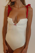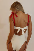 Our one piece best seller, The Natala one piece in ivory Apricot Cherry Red redefines classic swimwear with its sculptural silhouette. a ruched silk bodice paired with a softly defined sweetheart neckline offers elegance and support, while the pearly white silk catches the light with an effortless shimmer. refined for poolside days and resort nights.