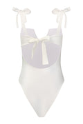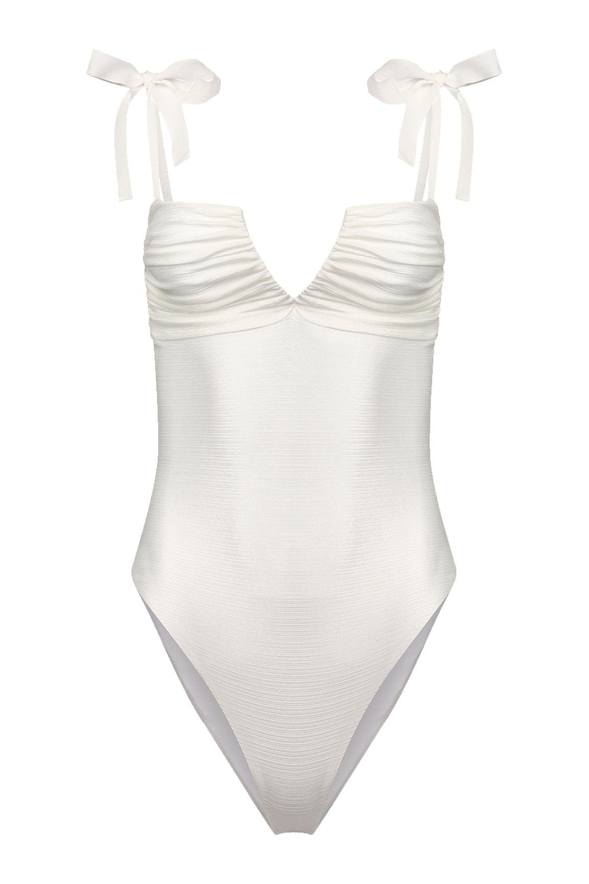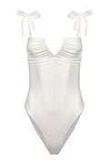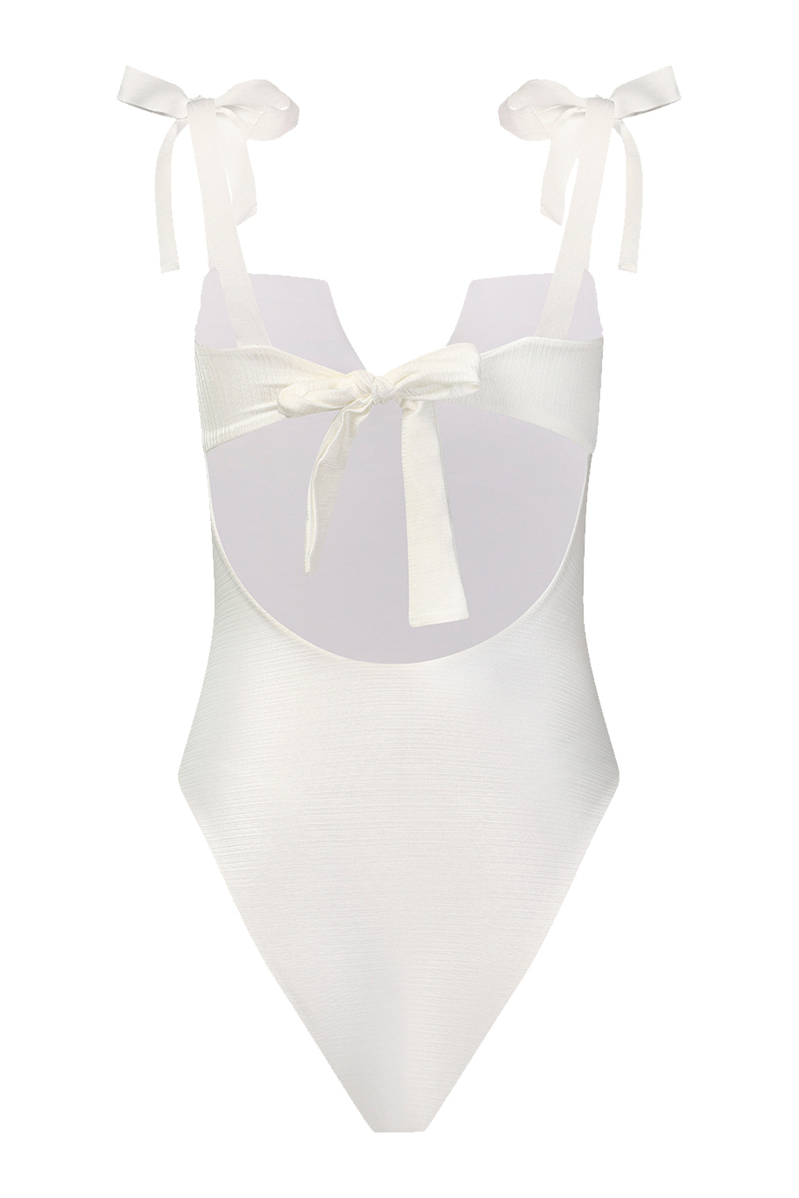 Our one piece best seller, The Natala one piece in Pearly White redefines classic swimwear with its sculptural silhouette. a ruched silk bodice paired with a softly defined sweetheart neckline offers elegance and support, while the pearly white silk catches the light with an effortless shimmer. refined for poolside days and resort nights.