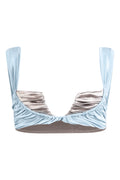 The Eclat Top in Pastel Blue Silver Plate is an ode to modern femininity and quiet luxury. Its sculptural silhouette and lustrous texture create a look that is both delicate and daring. A subtle shimmer runs through the double-layered fabric, catching the light like sunlight on the sea. The rippled inner layer evokes the movement of ocean waves—an artful detail designed to enhance and support the bust with grace. Cool, serene, and endlessly flattering, it’s the piece you'll reach for when elegance calls.