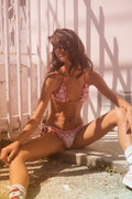 Classic red and white tribal design, 100% hand embroidered original divino seas piece, perfect for tanning, Brazilian bottom cut.