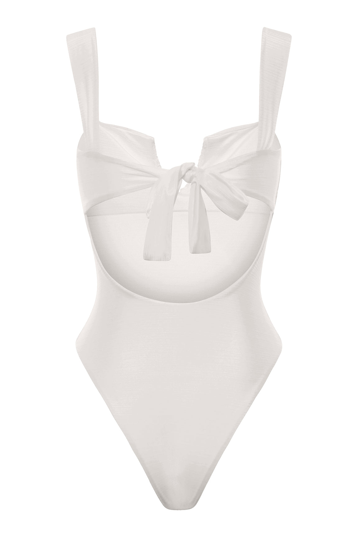 The Natala one piece in pearly white redefines classic swimwear with its sculptural silhouette. a ruched silk bodice paired with a softly defined sweetheart neckline offers elegance and support, while the pearly white silk catches the light with an effortless shimmer. refined for poolside days and resort nights.